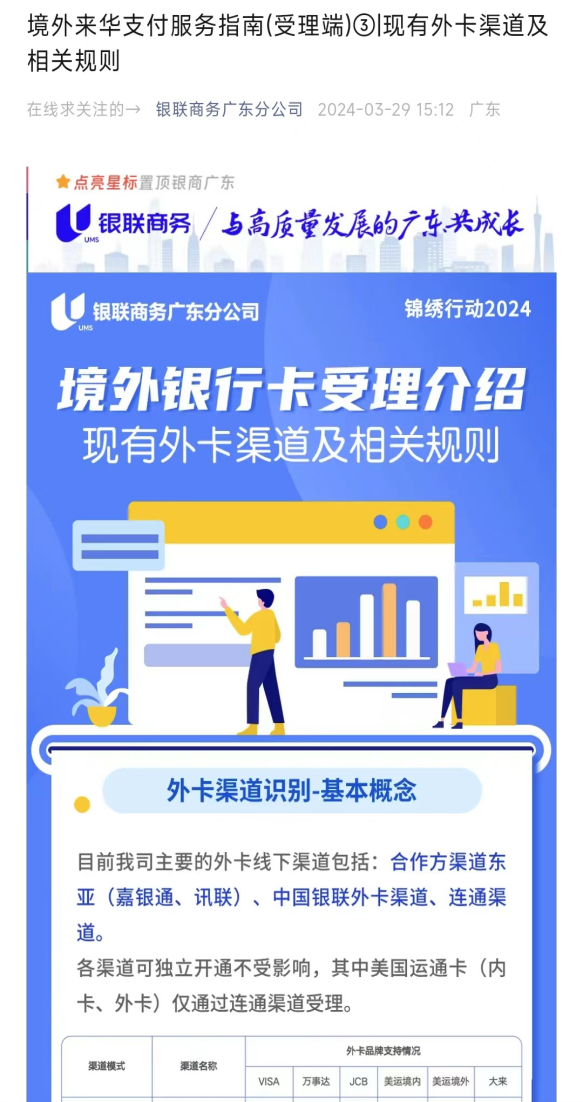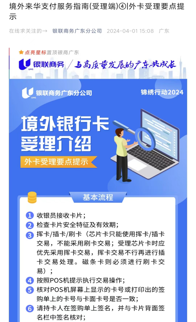 自人民銀行發布《中國人民銀行廣東省分行廣東省商務廳關于優化境外來粵人員支付服務的通知 廣東銀發[2024]8號》及錦繡行動開展以來,銀聯商務股份有限公司廣東分公司(以下簡稱“銀聯商務廣東分公司”)高度重視并積極貫徹落實黨中央、國務院、人民銀行關于進一步優化支付服務,提升境外來華人員、老年人等群體支付便利性的相關政策精神,持續優化外幣卡受理環境。