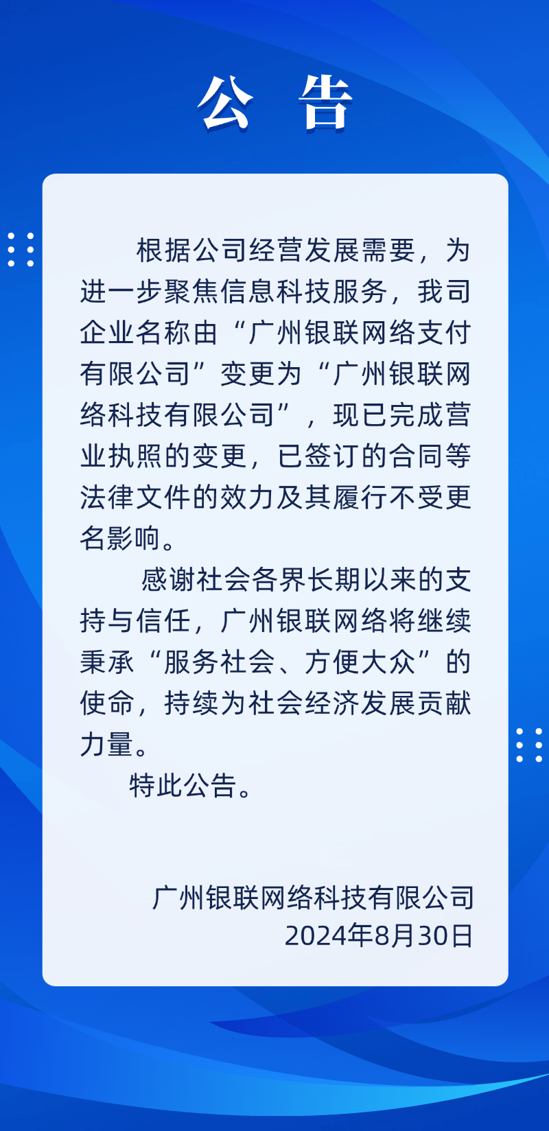【公告】“廣州銀聯網絡支付有限公司”正式更名為“廣州銀聯網絡科技有限公司”